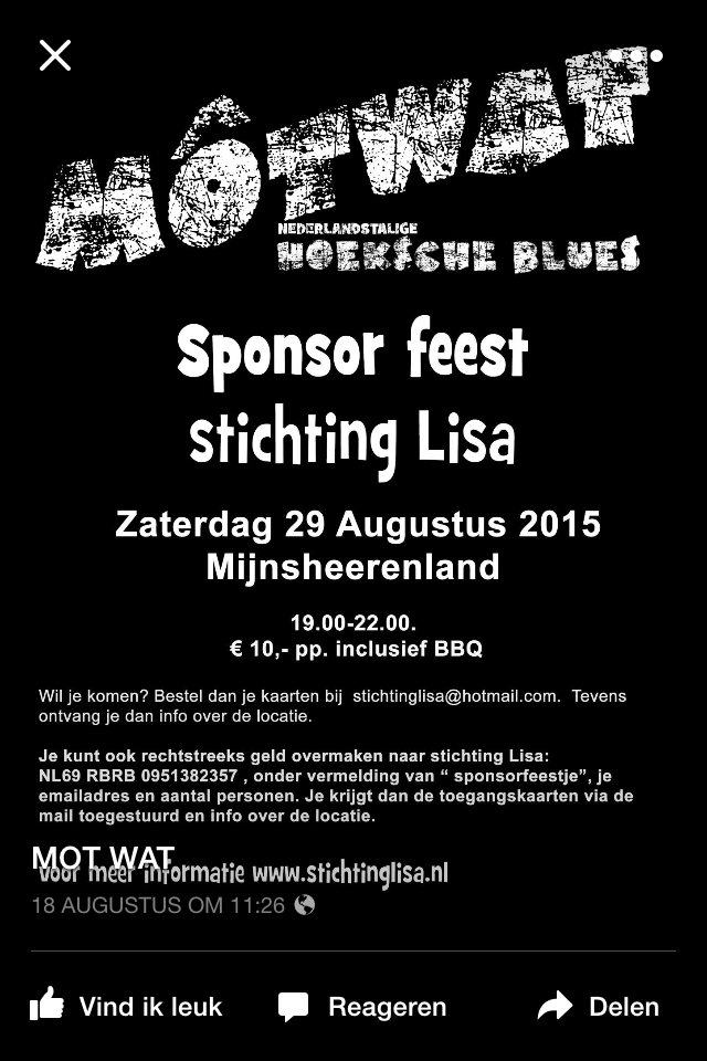 Wil je komen? Bestel dan je kaarten bij Rene of Ria of per email; stichtinglisa@hotmail.com, zodat we een beetje weten op hoeveel mensen we kunnen rekenen.
