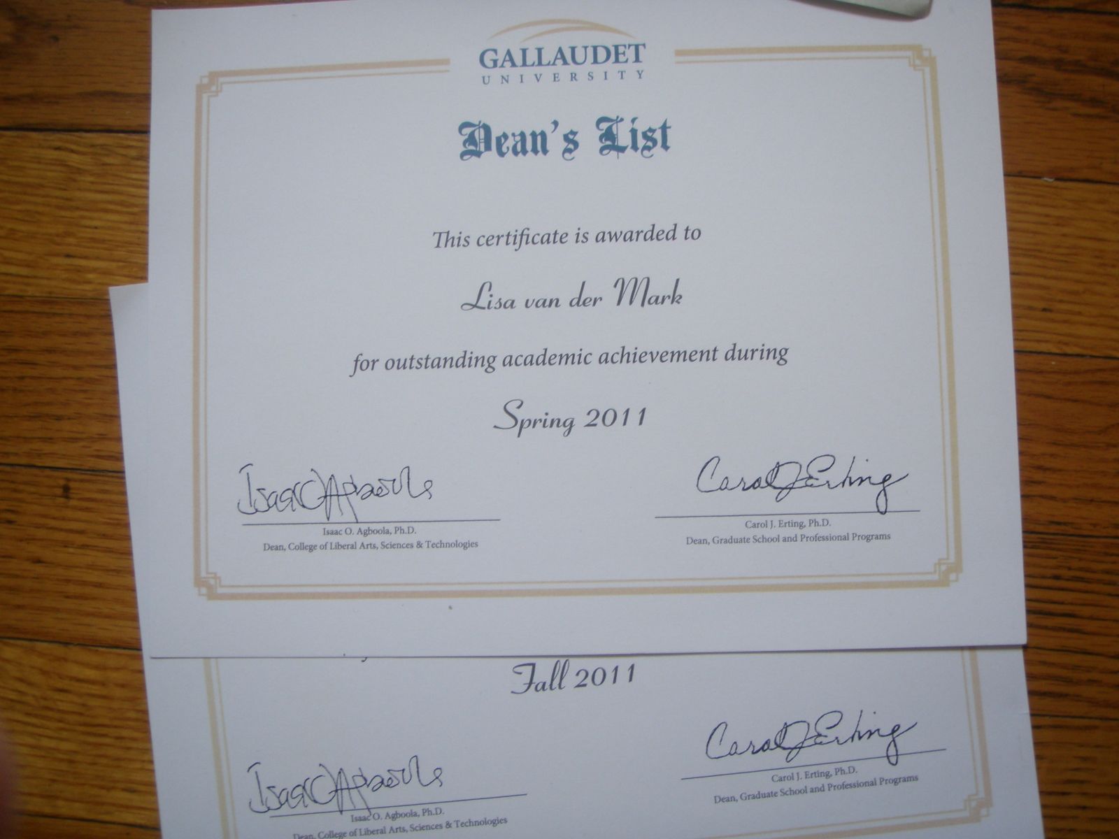 zowel in het voorjaar als in de herfst stond zij weer op de Deans list, kreeg een levenslang lidmaatschap van de International honor society in psychology at Gallaudet University en the Iron Woman Award van het Universiteits zwemteam